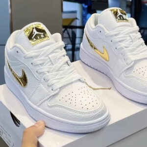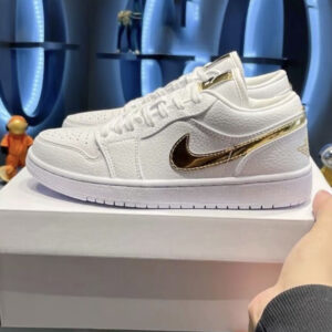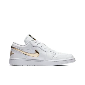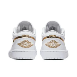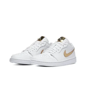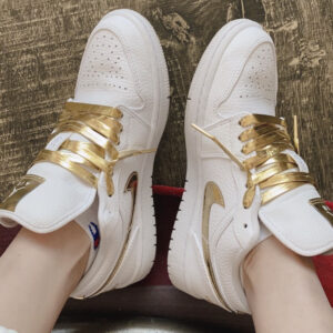 Giày Jordan 1 Low White Metallic Gold CZ4776-100 nổi bật với màu trắng chủ đạo, kết hợp với các chi tiết ánh kim màu vàng metallic ở logo Jumpman và Nike Swoosh. Sự kết hợp này tạo nên vẻ ngoài sang trọng và cuốn hút. Thiết kế cổ thấp (low-top) mang lại sự thoải mái và linh hoạt, phù hợp với nhiều hoạt động hàng ngày.