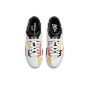 Giày Nike Dunk Low Scrap Mighty Swooshers DX6058-101 sở hữu phần upper bằng da và lưới, với các mảng overlay có hình dạng ngẫu nhiên, phá vỡ thiết kế truyền thống của dòng Dunk Low. Điểm nhấn đặc biệt của đôi giày này là logo Nike Swoosh có hiệu ứng ngọn lửa, cùng với tấm kim loại bạc trên lưỡi gà, mang lại cảm giác mạnh mẽ và cá tính.