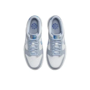 Nike Dunk Low Next Nature Blue Whisper Iridescent GS FJ4668-400 sở hữu phần upper bằng da tổng hợp, với lớp nền màu trắng kết hợp với các mảng overlay màu xanh nhạt. Điểm nhấn đặc biệt của đôi giày này là hiệu ứng iridescent trên logo Nike Swoosh, heel tab và tongue tab, tạo hiệu ứng chuyển màu lung linh.