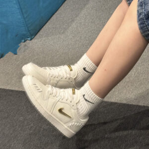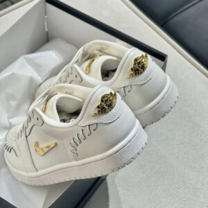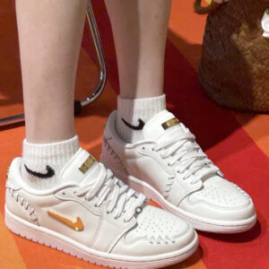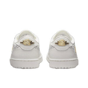Thiết kế: Giày tự hào có phần trên bằng da kết cấu màu trắng với đường khâu da quá khổ ở bàn chân trước và phía sau, gợi nhớ đến những chiếc túi xách cao cấp. Một chiếc Swoosh vàng kim loại trang trí phần tư bên, được bổ sung bởi một tấm “Air Jordan” (FN5032-100) bằng vàng trên lưỡi và biểu tượng Wings trên gót chân.