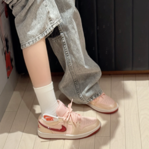 • Thiết kế: Giày có thiết kế thấp (low-top), với phần upper được làm từ chất liệu da cao cấp, kết hợp giữa lớp da màu đỏ hồng và phần da trắng ở mũi giày và lưỡi giày. Logo Nike Swoosh và biểu tượng Jordan trên lưỡi giày tạo nên điểm nhấn, nổi bật trên nền màu đỏ hồng tươi sáng.