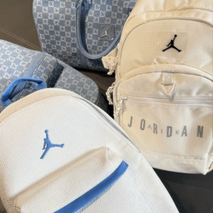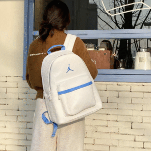 Thiết kế và chất liệu Phần thân balo được làm từ chất liệu polyurethane giả da bóng, tạo cảm giác sang trọng và dễ vệ sinh. Họa tiết monogram Jordan được dập nổi toàn bộ bề mặt, tạo điểm nhấn cá tính và đậm chất thể thao. Màu trắng chủ đạo giúp balo dễ phối với nhiều trang phục, từ streetwear đến casual.