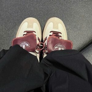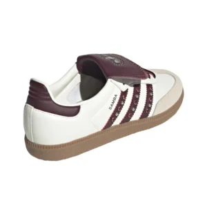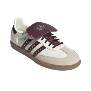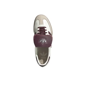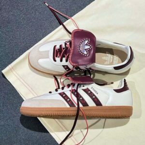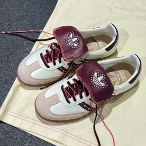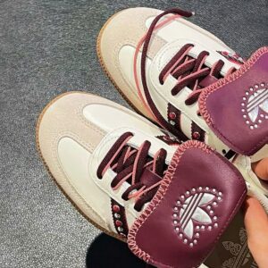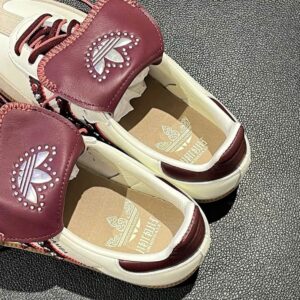- Logo 3 sọc của Adidas được làm từ chất liệu da màu đỏ rượu vang, nổi bật trên nền màu trung tính.
