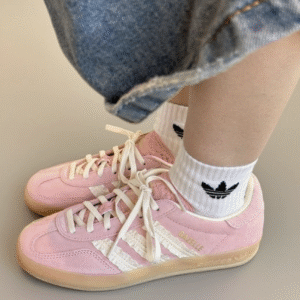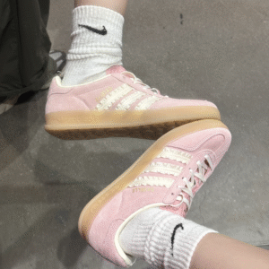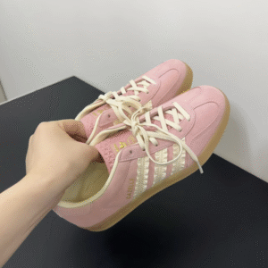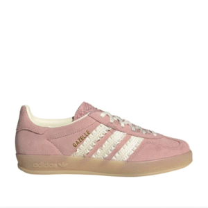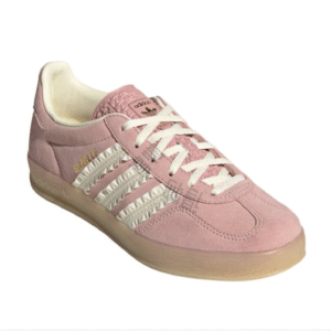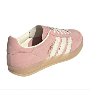 Adidas Gazelle Indoor Wonder Mauve [JS1413] được chế tác từ chất liệu da lộn mềm mại màu hồng pastel, kết hợp lớp lót da trắng Crew White cao cấp. Ba sọc đặc trưng của Adidas được làm bằng satin có viền frill nhẹ, tạo điểm nhấn nữ tính hiếm thấy trong các thiết kế Gazelle truyền thống. Đế ngoài bằng cao su gum 3 màu vàng nhạt, vừa cổ điển vừa tăng độ bám sàn hiệu quả. Logo vàng ánh kim ở lưỡi gà và bên hông giày hoàn thiện vẻ ngoài sang trọng và thời thượng.