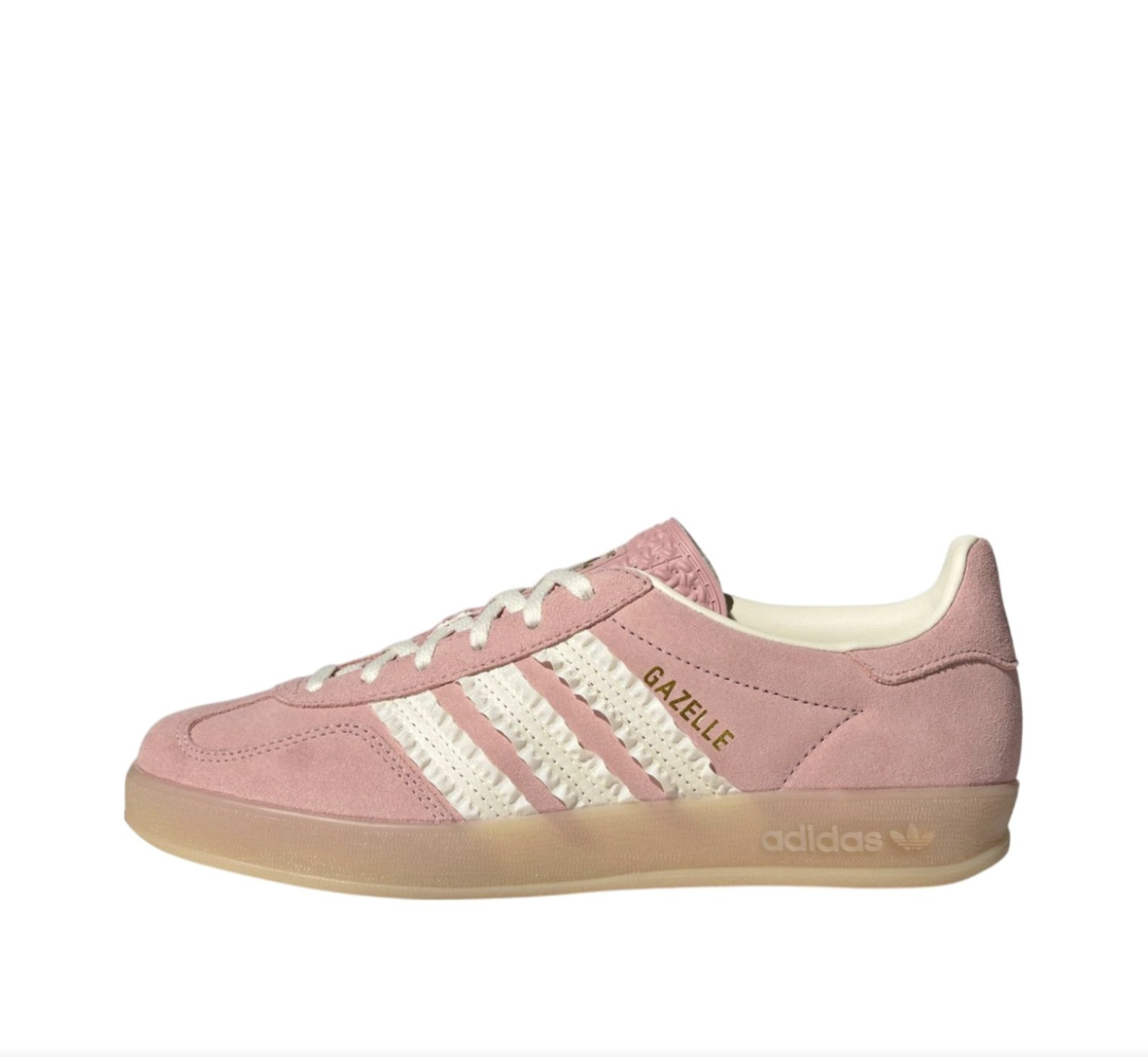 Adidas Gazelle Indoor Wonder Mauve [JS1413] được chế tác từ chất liệu da lộn mềm mại màu hồng pastel, kết hợp lớp lót da trắng Crew White cao cấp. Ba sọc đặc trưng của Adidas được làm bằng satin có viền frill nhẹ, tạo điểm nhấn nữ tính hiếm thấy trong các thiết kế Gazelle truyền thống. Đế ngoài bằng cao su gum 3 màu vàng nhạt, vừa cổ điển vừa tăng độ bám sàn hiệu quả. Logo vàng ánh kim ở lưỡi gà và bên hông giày hoàn thiện vẻ ngoài sang trọng và thời thượng.