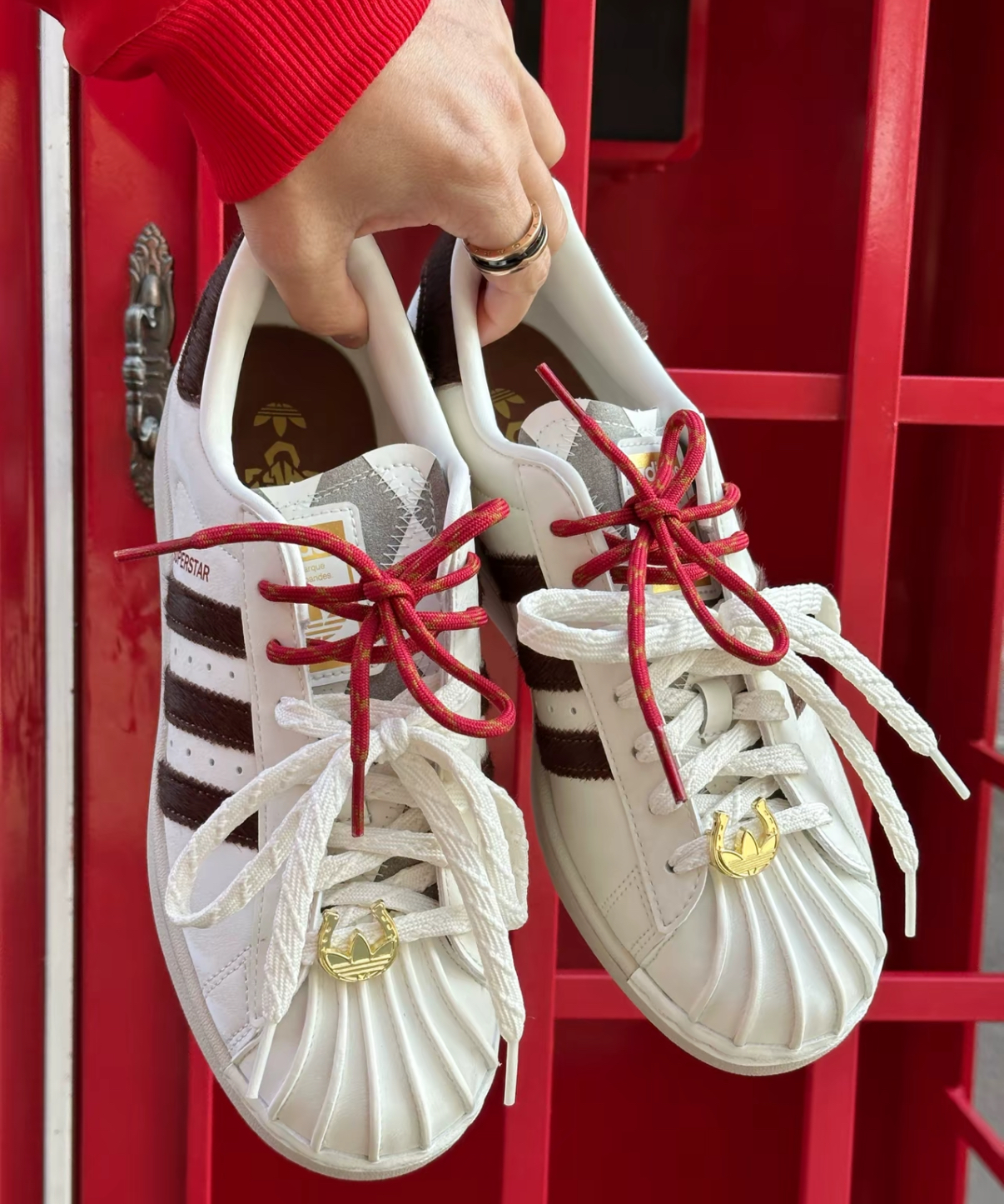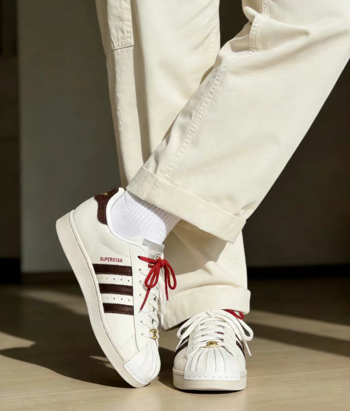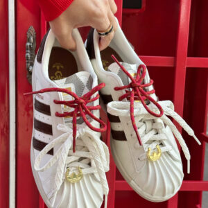 Thiết kế và chất liệu Được chế tác từ da cao cấp, sản phẩm mang lại sự bền bỉ và cảm giác thoải mái khi sử dụng. Tông màu chủ đạo trắng kết hợp cùng các chi tiết đỏ và vàng tượng trưng cho sự may mắn, thịnh vượng. Logo Adidas Originals cùng ba sọc đặc trưng được thiết kế tinh tế, giữ nguyên nét biểu tượng của dòng Superstar.