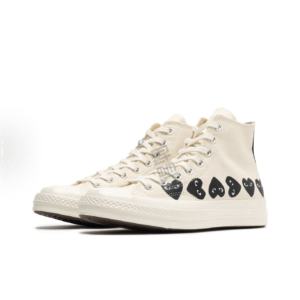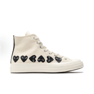 Thiết kế biểu tượng: Phần upper bằng canvas màu beige được tô điểm bằng logo trái tim đỏ có đôi mắt đặc trưng của Comme des Garçons Play – biểu tượng thời trang được yêu thích toàn cầu. Đế cao su trắng, mũi giày tròn và dây buộc trắng giữ nguyên tinh thần cổ điển của dòng Chuck Taylor 70s.